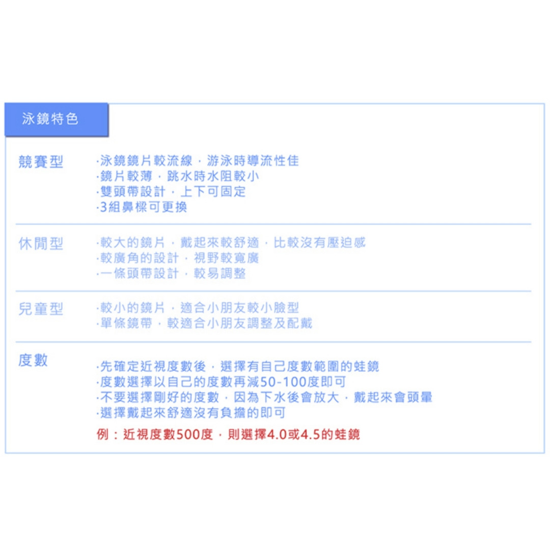 *度數選擇以自己的度數再減50-100度即可 例如:近視度數500度,則選擇4.0或4.5的蛙鏡 國小~成人皆可戴
