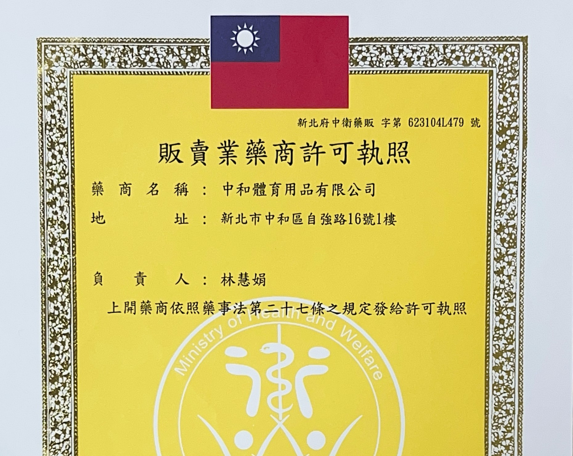 (9.) 醫療器材商/藥商許可證字號:中衛藥販 字第623104L479號
