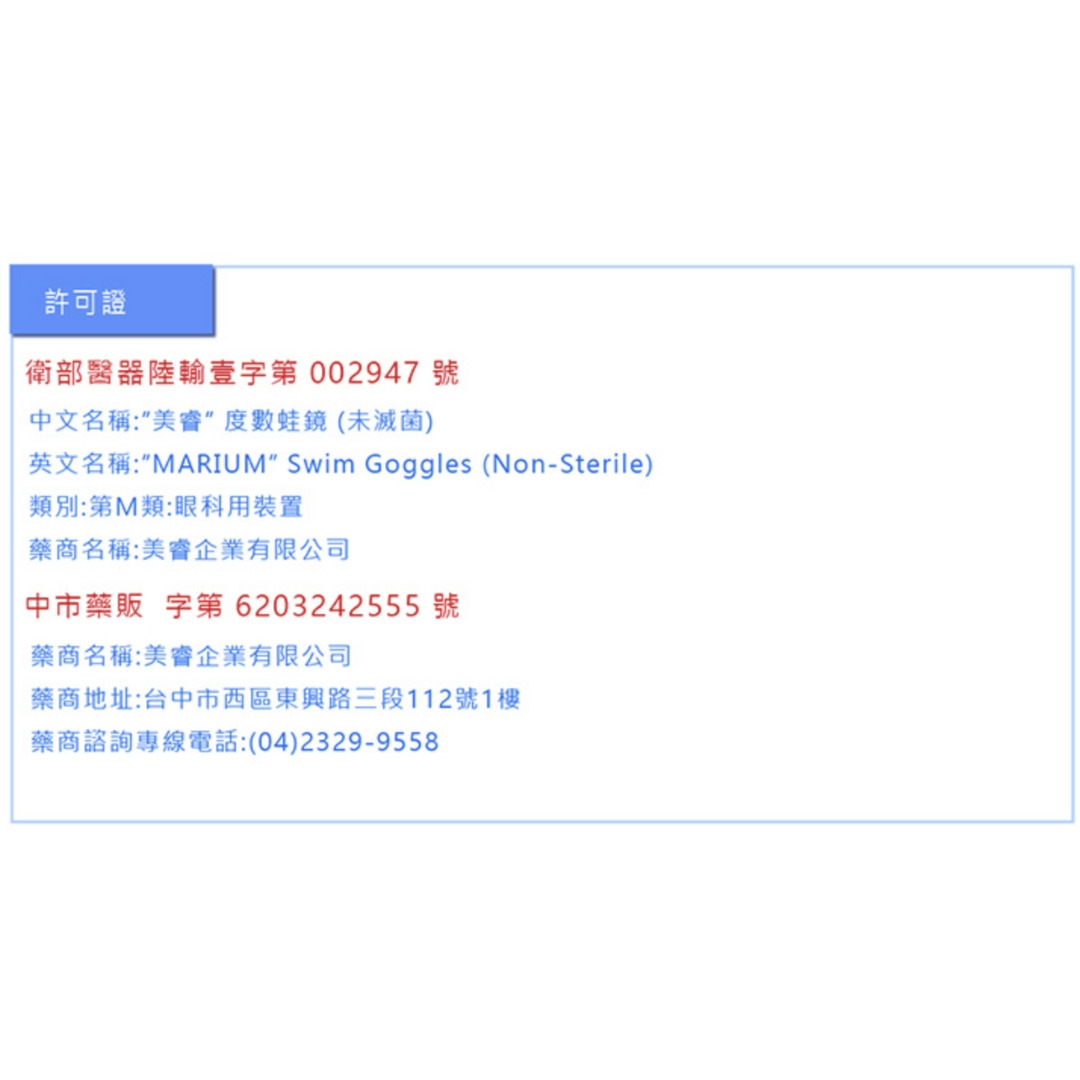 (1.) 醫療器材品名:"美睿" 度數蛙鏡 (未滅菌)